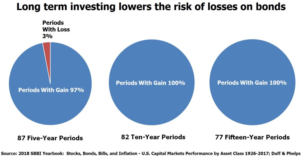 - Over all holding periods, bonds have fewer loss periods than stocks. This is the conventional wisdom. Importantly, for longer holding periods (i.e., more than a 15-year period), there are no loss periods for stocks or bonds.