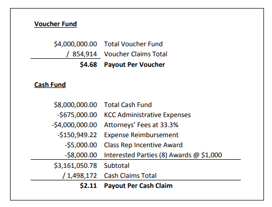 Under this pro rata dilution, the Settlement Fund (still not distributed due to ongoing appeals) will be divided between the number of ultimate Claimants. After the Plaintiffs’ lawyers are granted their 1/3 ($4 million) plus nearly a million in out of pocket costs for litigation and claims administration, approximately 60% remains for the unexpectedly large number of Claimants. As a result, the Proposed Settlement is expected to provide $2.11 for cash Claimants and $4.68 for voucher Claimants, calculated by Plaintiffs’ lawyers as follows: